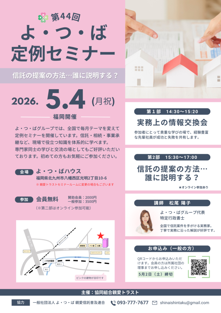 よ・つ・ばグループは、全国の専門家が集まり「信託・相続・資産承継」などに関する知識共有と実務向上を目的に、毎月4日(よ・つ・ばの日)にセミナーを開催しています。地域に根ざした実例と、多様な立場からの意見交換ができるのが特徴です。