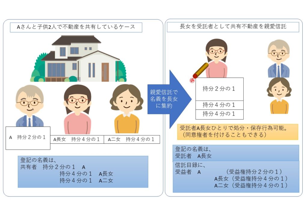 また、共有者全員が親愛信託をして名義人を一人に集約すると、売却などの処分行為がその受託者の判断で行えます。