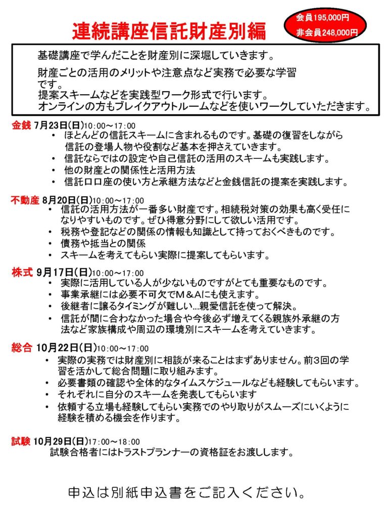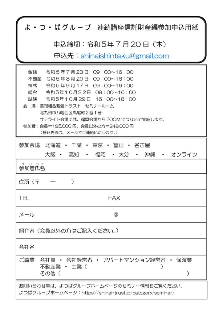 そこで、よ・つ・ばグループ(協同組合親愛トラスト)では、「信託」の実務ができる専門家を増やし、多くの人が受任できることを目指して「連続講座 信託財産別編」を行います。