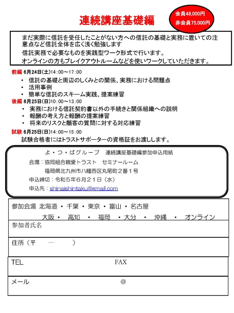 そこで、よ・つ・ばグループ(協同組合親愛トラスト)では、「信託」の実務ができる専門家を増やし、多くの人が受任できることを目指して「連続講座」を行います。