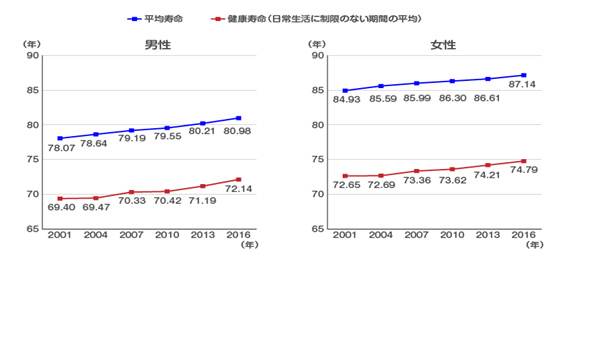 2016年における我が国の平均寿命は男性80.98歳、女性87.14歳であり、健康寿命とはそれぞれ約9年、約12年の差があります。平均寿命とは「0歳における平均余命」のことで、一方、健康寿命とは、「健康上の問題で日常生活が制限されることなく生活できる期間」のこといい、平均寿命と健康寿命の差は日常生活に制限のある「不健康な期間」を意味し、その期間は、2016年では男性8.84年、女性12.35年となっています。