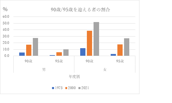 それでは、男女別に90歳を迎える者の割合を見てみると2021年度集計で、男性の28.1%女性でなんと52.6%が90歳を迎えることができています。(図-3)男性の4人に1、女性の2人に1人が90歳を迎えることができていますが、95歳となると男性10.1%女性27.1%と急激に下がることがわかります。