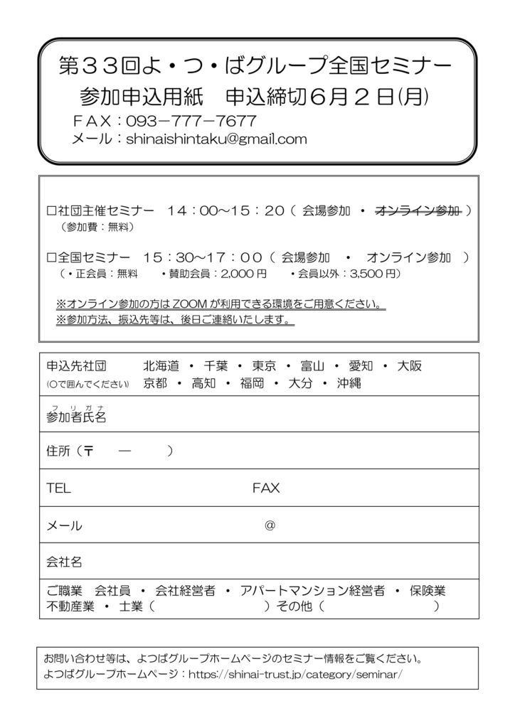 | 【福岡】 | 一般社団法人 よ・つ・ば親愛信託普及連合(本部事務局) TEL/FAX:093-777-7677 メール:shinaishintaku@gmail.com |