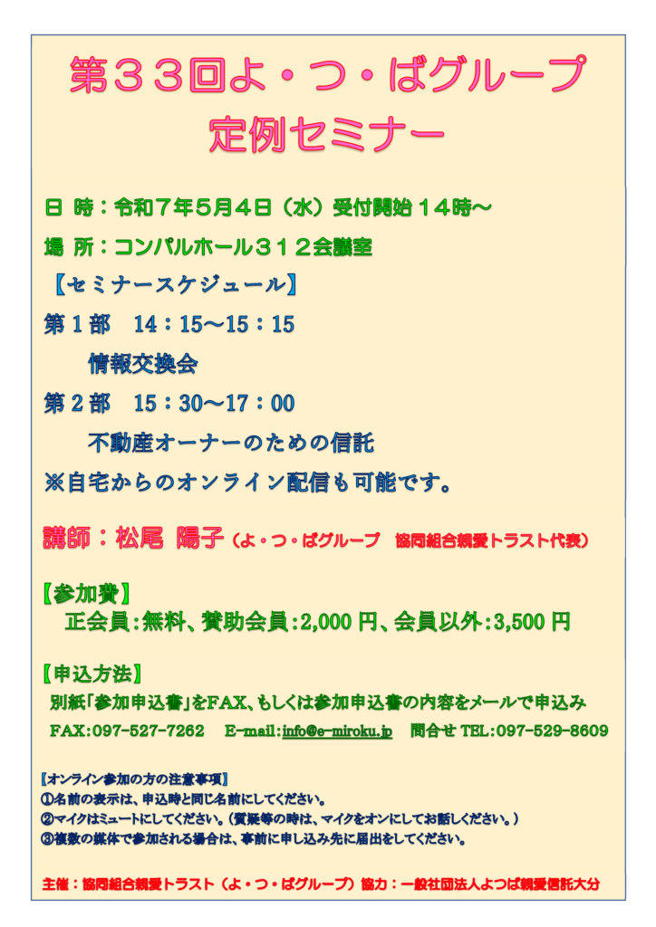 よ・つ・ばグループでは、信託の普及を目的として、毎月4日(よ・つ・ばの日)に「全国セミナー」を開催しています。