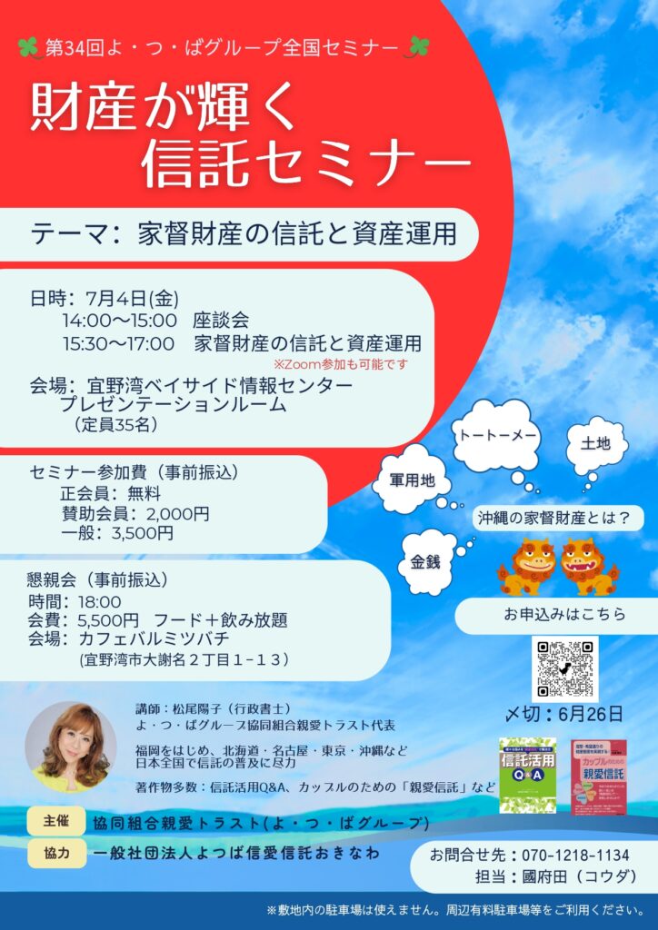 このたび、「第34回よ・つ・ばグループ全国セミナー」を沖縄県宜野湾市にて開催する運びとなりました。今回のテーマは 「家督財産の信託と資産運用」。沖縄ならではの相続観や資産継承文化を背景に、実践的な信託活用法を学べる内容となっております。