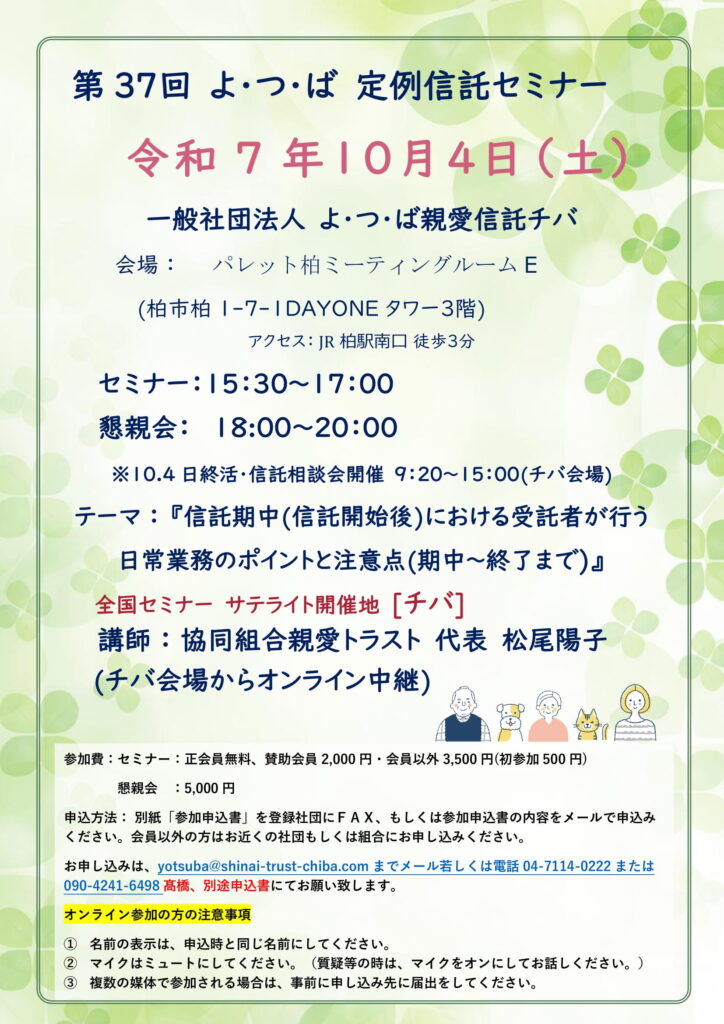 このたび、「第37回よ・つ・ばグループ全国セミナー」を千葉・柏市にて開催します!今回のテーマは 「信託期中(信託開始後)における受託者が行う日常業務のポイントと注意点(期中~終了まで)」です。